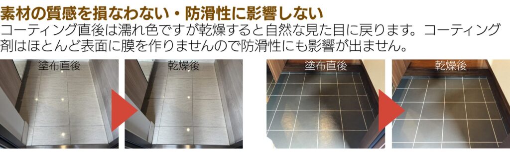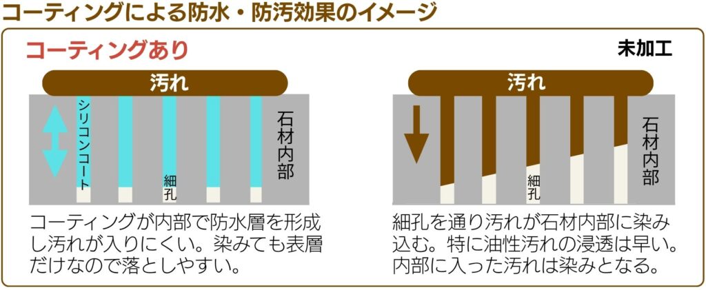 ホテルや公共施設など多くの人が利用する石・タイル床の美観維持に貢献している石材シリコンコート。マンションや一戸建ての石材・タイルの汚れ、セメント目地の染み予防に高い効果を発揮します。
